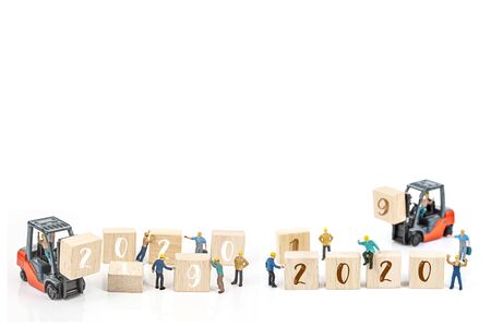 miniature worker team building standing front of forklift machine with white 2020 number on wooden block on white background, decoration to Happy new year 2020 concept.