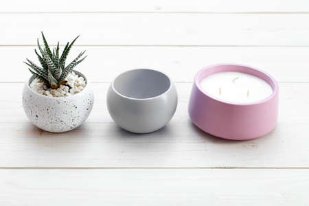 Succulents in concrete pots. Indoor cacti, indoor plants. fashion trends in design. burning candles.