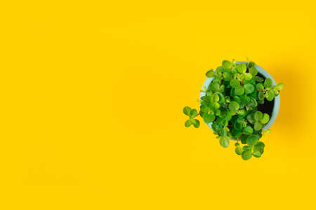Succulents in a pots on a yellow background. Top view with copy space. Flat lay.