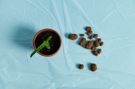 Flat lay composition with scattered expanded clay, drainage for plants on a transparent film on a blue background next to a clay pot with aloe flower