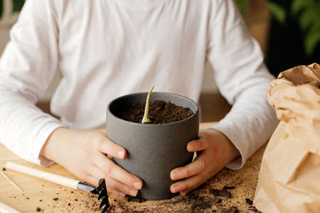 Close-up girls hands planting a garlic sprout. Young botanist and gardener. Hobby for home
