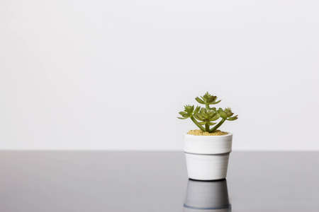 Flower pot on white table with copy space. Minimal style.