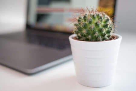 Cactus in white pot on white table with laptop computer.