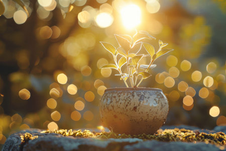 Sunlight envelops a young plant in a weathered pot, against a bokeh background of golden orbs.