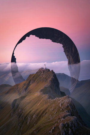 A stunning landscape photograph featuring a mountain peak framed by a natural arch. The image captures the serene beauty of the scene at sunset, with soft hues of pink and purple in the sky. The mountain is surrounded by clouds, adding a sense of tranquility and majesty.