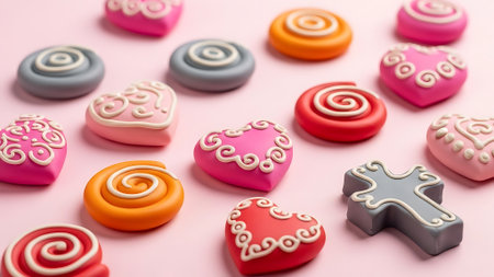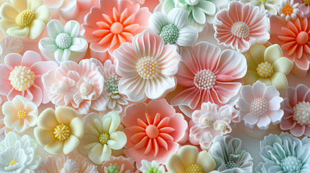 Close-up of intricately designed candy flowers, displayed on a pastel background. Ideal for decorative and artistic themes.