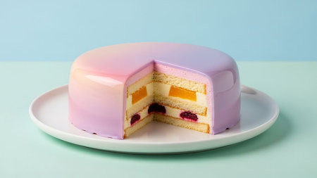 A modern mirror glaze cake with a pastel gradient finish, revealing layers of cake and fruit filling when sliced.