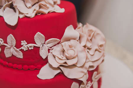 Unrecognisable woman in bakery decorating wedding cake with white fondant