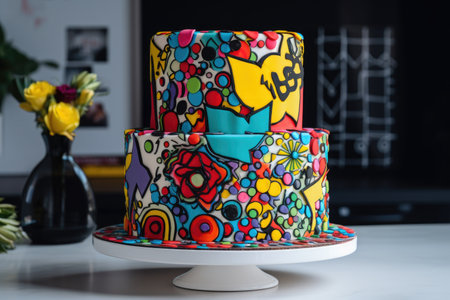 decorative cake in the form of pop art masterpiece, with pops of color and bold designs, created with generative ai