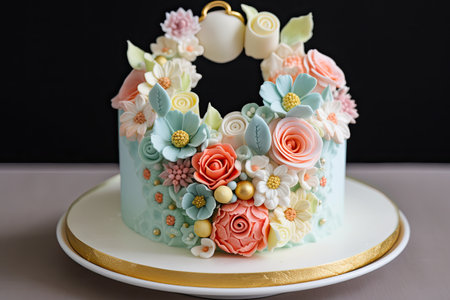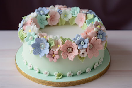 ring cake with pastel flowers and intricate sugar details, created with generative ai