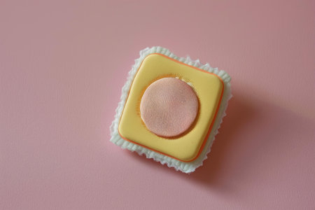 Single compact cosmetic powder puff on a soft pink surface, highlighting elegant beauty tools