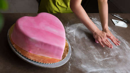 Woman preparing royal icing for heart shaped wedding cake decorating