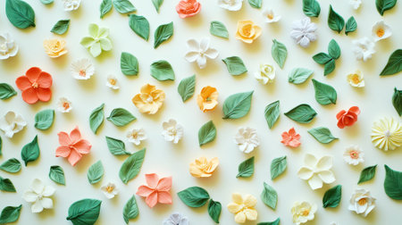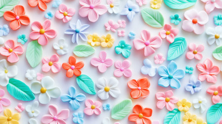 Floral pattern featuring delicate flowers made of polymer clay in pastel colors. Light background. Generative AI.