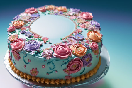 Delicious pink floral cake with creamy icing and elegant decoration on a blue background