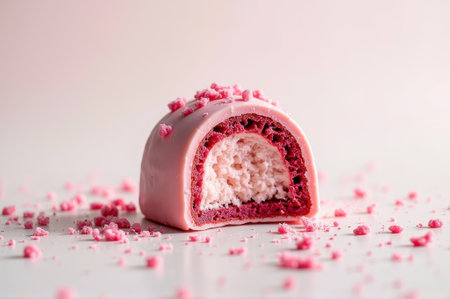 Pink mousse cake with cream filling and sprinkles in elegant slice display. That the image is generated using AI.