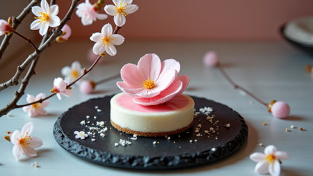 Elegant cherry blossom dessert on black slate plate with delicate pink flowers. That the image is generated using AI.