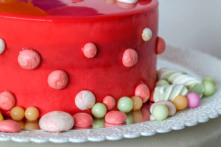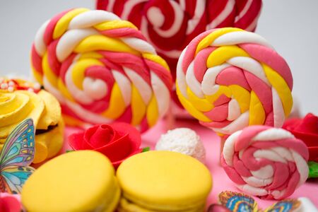 Bright cake for a birthday with macaronni, butterflies, lollipops