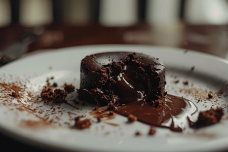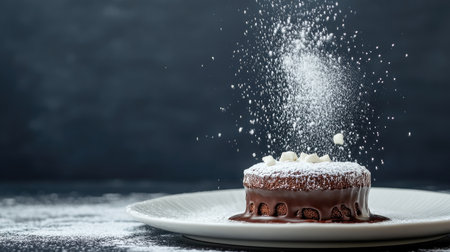 A tempting chocolate cake topped with a delicate dusting of powdered sugar, perfect for dessert lovers. Ideal for gourmet photography or baking inspiration.