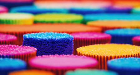 Colorful donut cupcakes with sprinkles on floral fabric background. That the image is generated using AI.