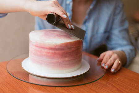A pastry chef girl makes a wedding cake with her own hands and squeezes the cream on the layers of the cake. A pastry chef makes a pink cream using a cooking spatula. Put the cream on the cake