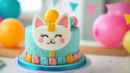 A vibrant cat-themed cake perfect for children's birthday celebrations. Adorned with playful colors and whimsical designs, it captures joy and creativity.
