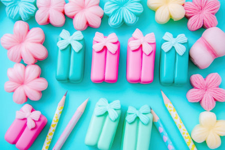 Gift Soaps and Pencils Arranged on Blue Background, Creative Flat Lay with Decorative Soaps.