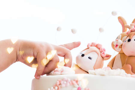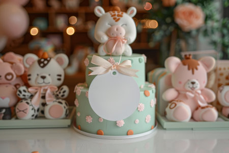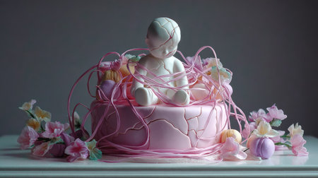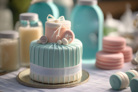 An AI generated illustration of an appetizing baby cake in pastel colors with figures and sprinkles