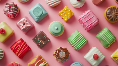 A vibrant selection of assorted colorful pastries, featuring intricate designs and toppings, arranged on a bright pink background.