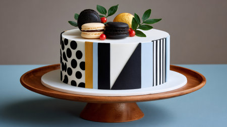 Gourmet cake decorating with abstract minimalist design and premium dessert toppings for celebration