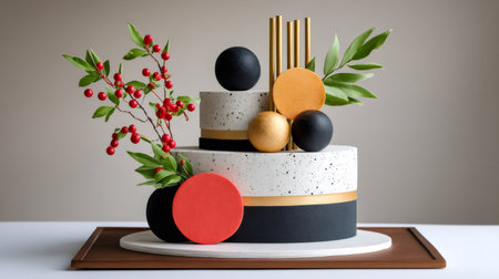 Tiered cake featuring a minimalist design, decorated with geometric shapes and red berries