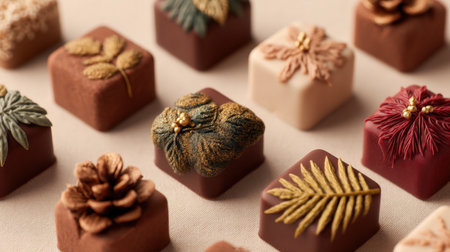 Discover a stunning array of handcrafted chocolate confections adorned with intricate floral and leaf designs, perfect for gourmet desserts and special occasions.