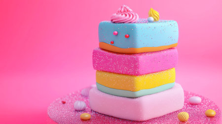 Vibrant tower of colorful cake slices topped with playful frosting and sprinkles. Perfect for festive celebrations, parties, or joyful decorations.