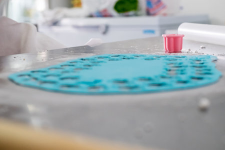 A blue and pink cake pan sits on a counter with a pink icing tip cake decoration