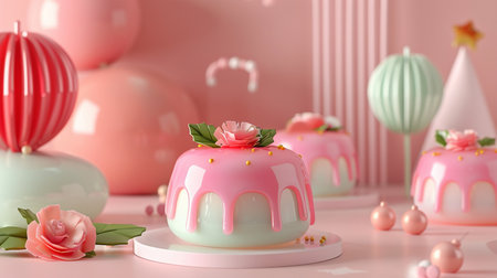 Charming pastel cakes with frosting drips and rose decorations, presented on a soft, elegant background.