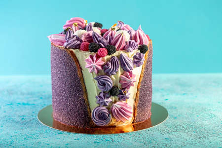 Close-up of blue cake with colorful flowers, sugar falling, kitchen