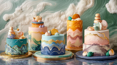 Vibrant and artistic cake collection featuring various designs and decorations, perfect for special events, celebrations, and culinary art showcasing creativity and style.