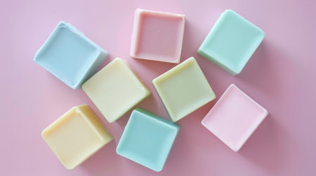 Various pastel-colored shower loofahs are beautifully arranged, showing soft textures and colors.