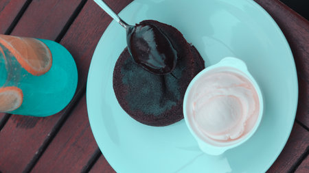 AI Generated. A green cake with a flower on top sits on a table next to a glass of ice water