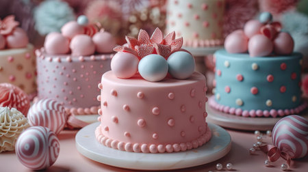 Beautiful pastel-colored cakes decorated with pink polka dots and ribbons, surrounded by festive ornaments, ideal for celebratory occasions.