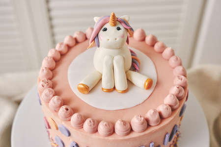 Unicorn cake on a wooden background and lace. Cute unicorn layered homemade cake decorated with bow, rose flowers, golden corn and ears. Copy space.