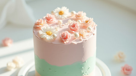 A charming pastel cake features intricate flowers on top, displayed in a softly lit environment, ideal for parties, birthdays, or gatherings with loved ones.