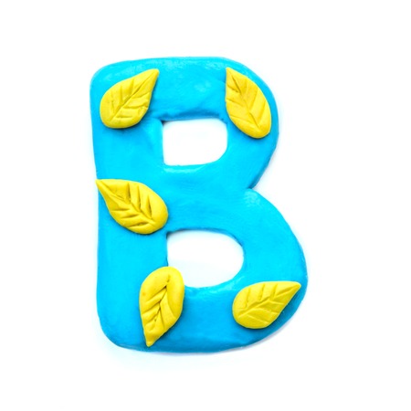 Plasticine light blue letter B of the English alphabet with yellow autumn leaves