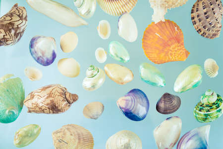 colorful seashells background with copy space on blue