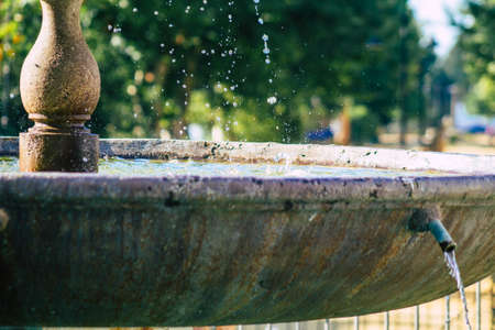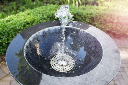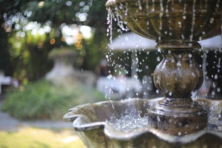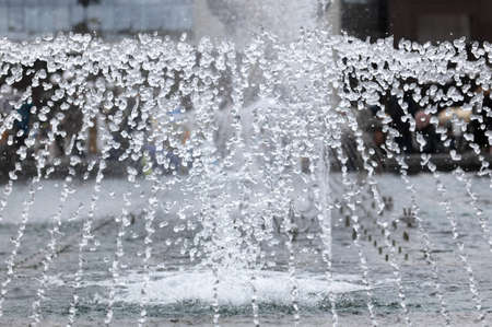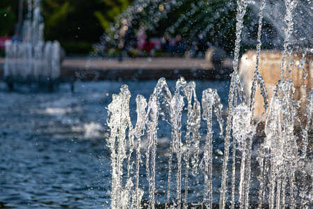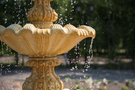 Fountain element close-up. The concept of summer freshness and vacation. Flying drops of water.