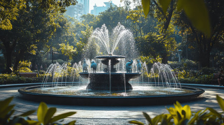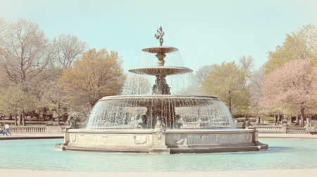 A stunning fountain with cascading water stands as a centerpiece in a serene park, surrounded by vibrant spring trees and a clear blue sky. Perfect for artistic or leisure themes.