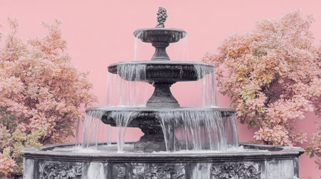A stunning three-tiered fountain with cascading water sits gracefully in a garden filled with soft pink flowers, creating a tranquil and inviting atmosphere.