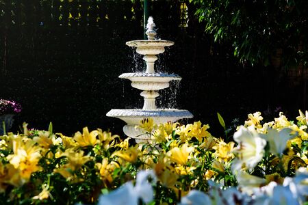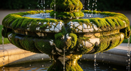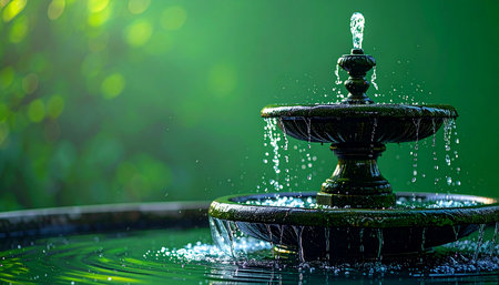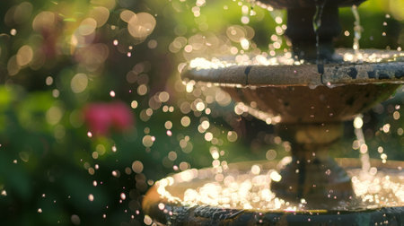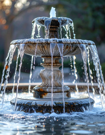 Sunlight catches the cascading water of a classic tiered stone fountain, creating a tranquil and refreshing scene.