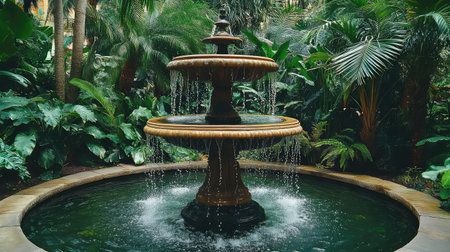 This serene image features a stunning three-tiered fountain set against a lush backdrop of tropical foliage, creating a tranquil atmosphere ideal for relaxation.