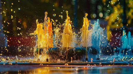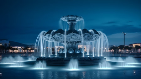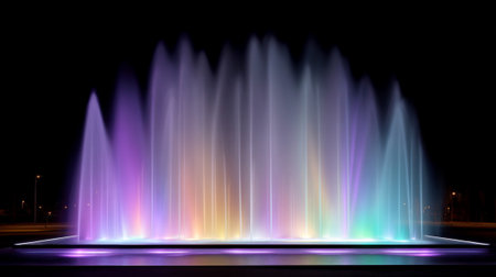 An illuminated water fountains glowing with colored lights create mesmerizing display at night, captivating viewers with their vibrant hues and dynamic movement