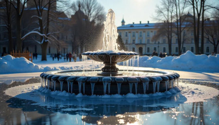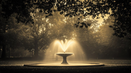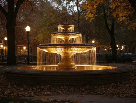 A classic stone fountain comes to life as illuminated water splashes gracefully from its ornate basin.